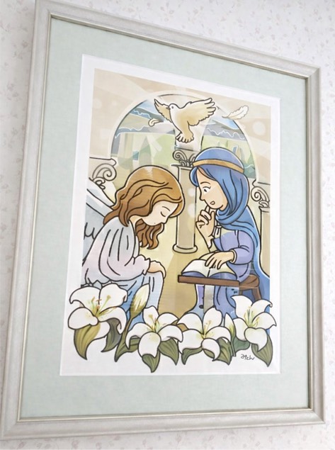 新約聖書に書かれているエピソードの一つである「受胎告知」をテーマにとのご希望でしたので、それを私の画風にアレンジさせていただき、上記のような作品となりました。